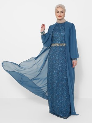 Tavin Petrol Güpür Ve Payet Detaylı Tüllü Abiye Elbise