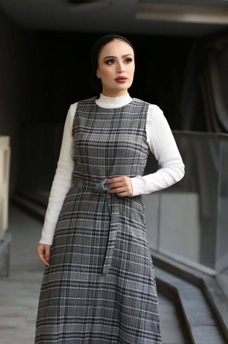 In Style Antrasit Ekose Desenli Kuşaklı Jile