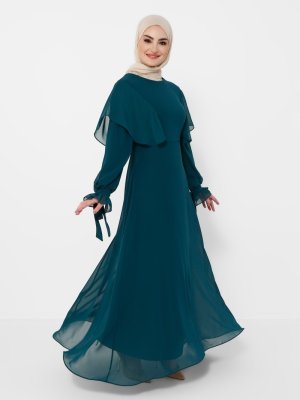 Tavin Zümrüt Yeşili Balon Kollu Tüllü Elbise