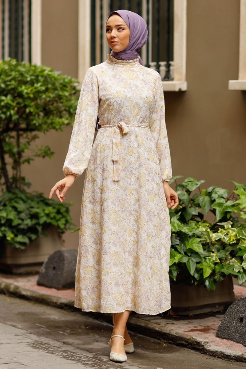 In Style Lila Baskılı Çiçek Desen Brode Elbise