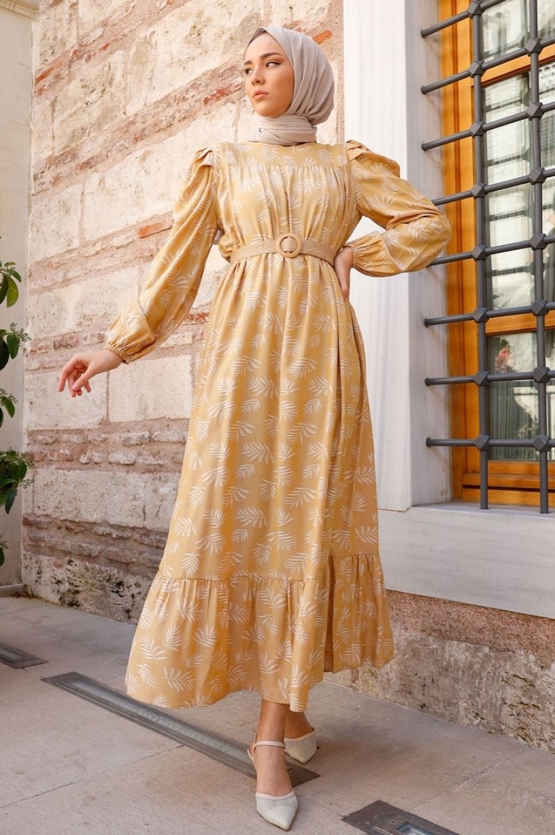In Style Hardal Yaprak Desen Jakarlı Elbise