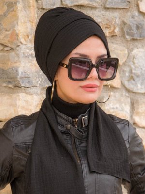 AİŞE TESETTÜR Siyah Desenli Atkılı Bone
