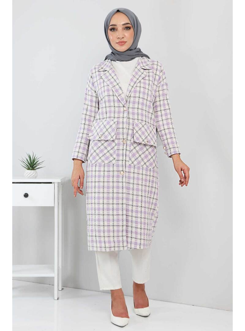 Tesettür Dünyası Lila Cep Detaylı Uzun Kap