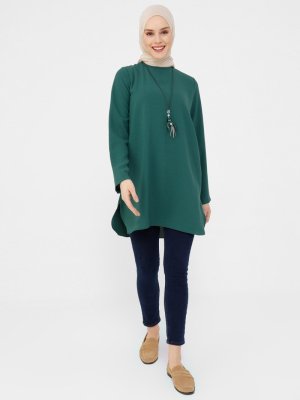 Refka Zümrüt Yeşili Kolye Detaylı Yanları Yırtmaçlı Aerobin Tunik