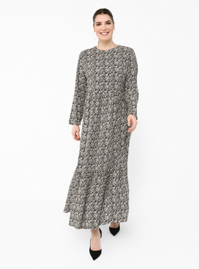 Alia Siyah Büyük Beden Doğal Kumaşlı Çiçek Desenli Elbise