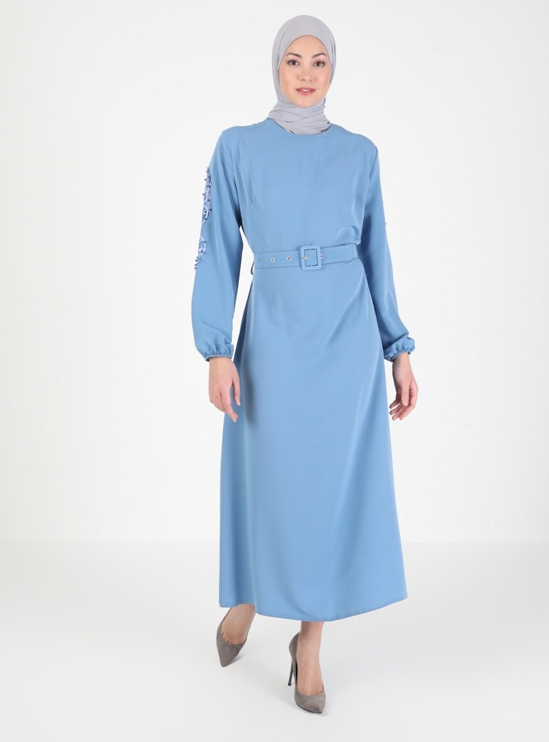Mileny Mavi Boncuk Detaylı Dantelli Elbise