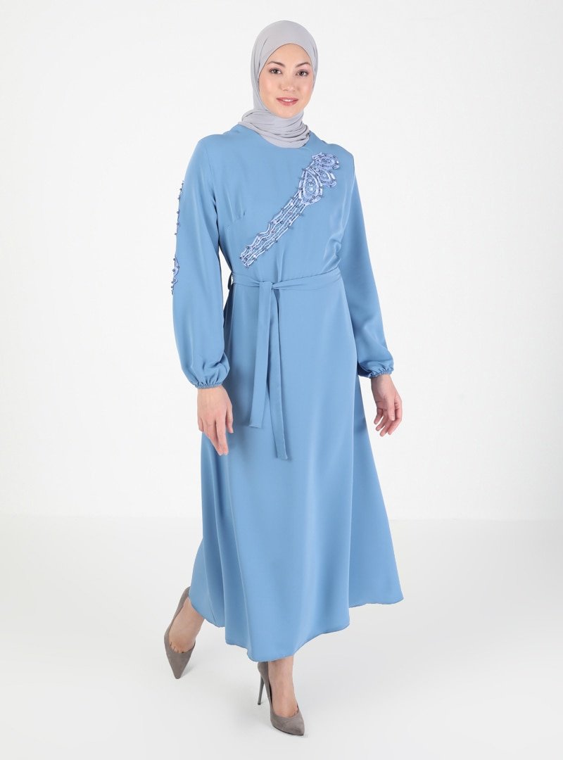 Mileny Mavi Boncuk Detaylı Dantelli Elbise
