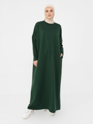 Refka Koyu Zümrüt Gizli Cep Detaylı Salaş Elbise