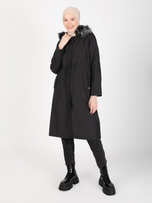 Olcay Siyah Kapüşonu Kürk Detaylı Mont