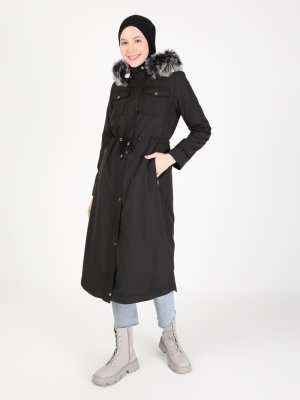 Olcay Siyah Kapüşonu Kürk Detaylı Mont
