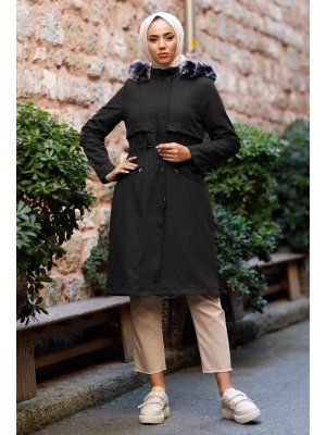 In Style Siyah Cebi Fermuarlı Deri Detay İçi Kürklü Kaban