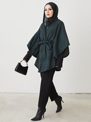 MODAEFA Petrol Mavi Kare Desenli Yarasa Kollu Panço