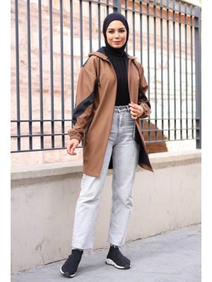 In Style Taba Siyah Kolu Şerit Çift Renk Trenç