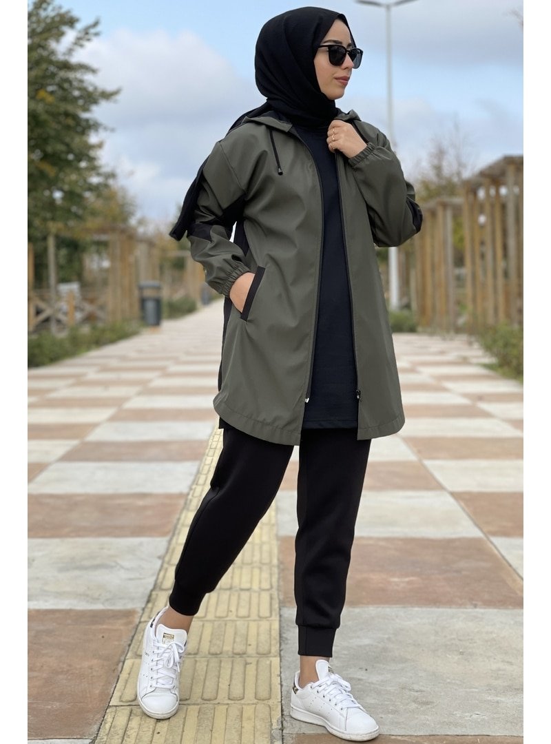In Style Haki Siyah Kolu Şerit Çift Renk Trenç
