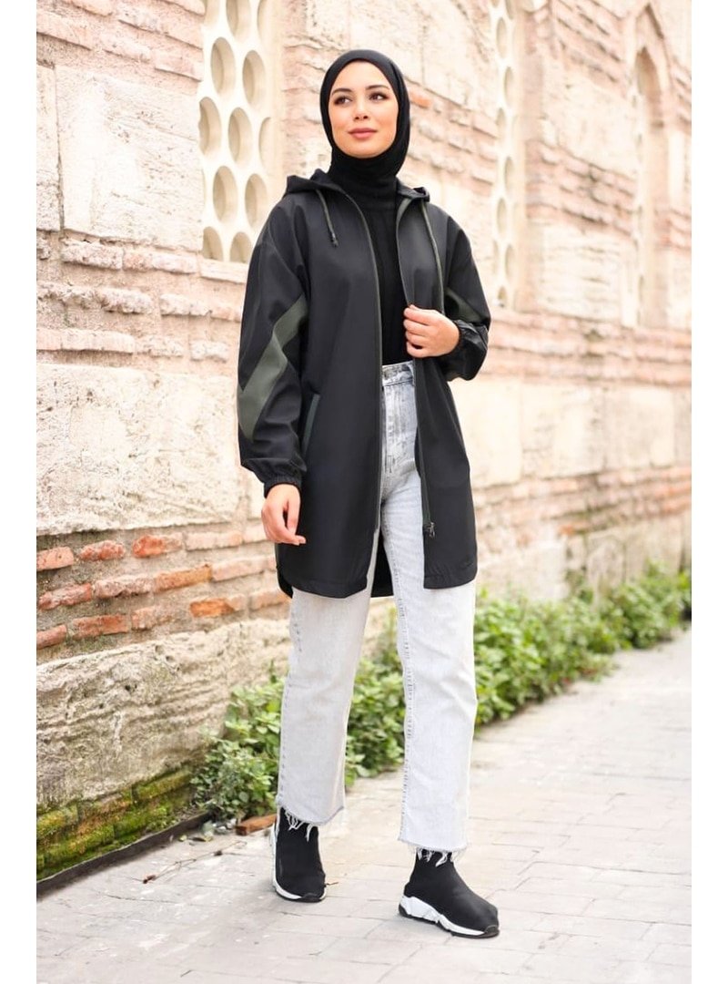 In Style Siyah Haki Kolu Şerit Çift Renk Trenç