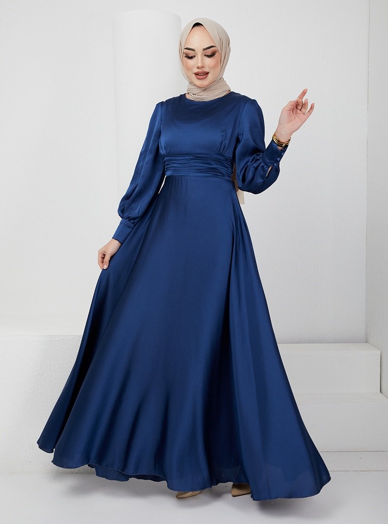 Olcay Koyu İndigo Beli Pilise Detaylı Kuşaklı Abiye Elbise