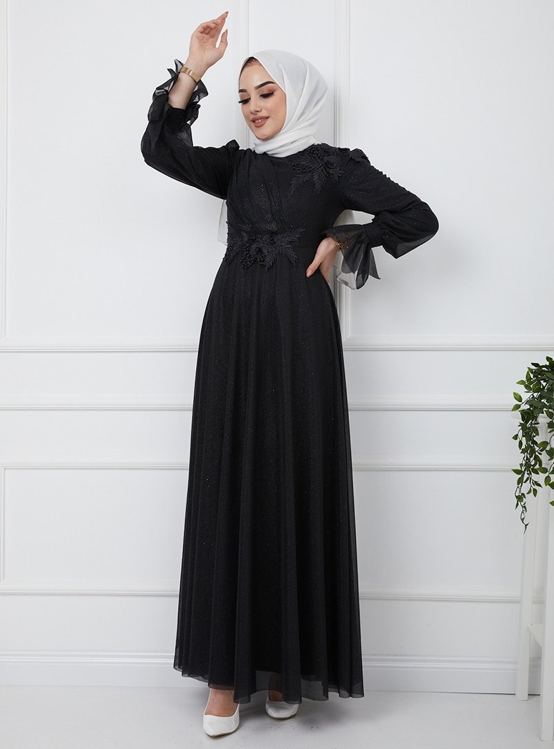 Olcay Siyah Çiçek Dantel Detaylı Simli Tüllü Abiye Elbise