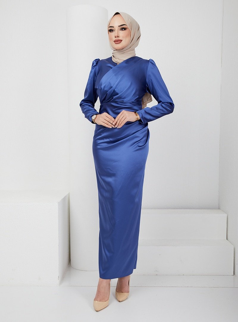 Olcay Koyu İndigo V Yaka Pile Detaylı Saten Abiye Elbise