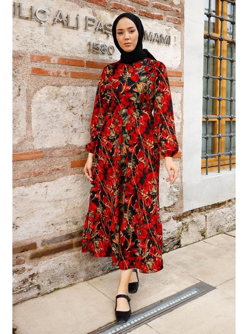 In Style Bordo Fırfırlı Lale Desenli Elbise