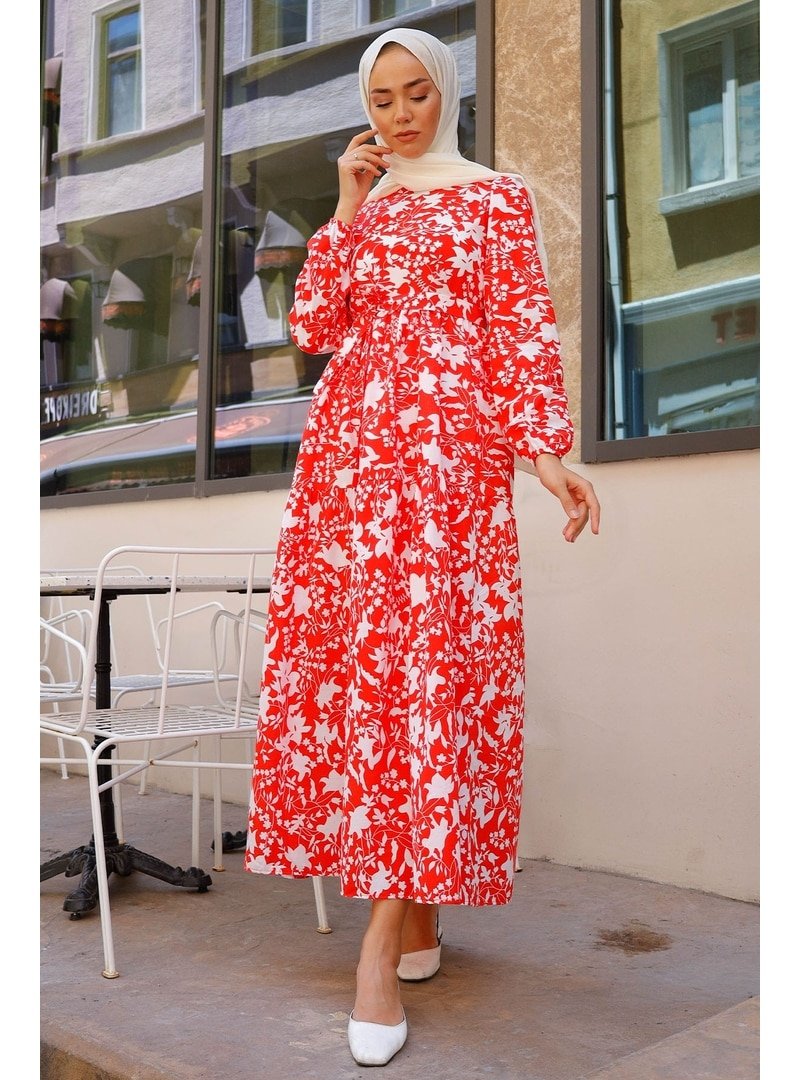 In Style Kırmızı Prenses Omuz Fulya Desen Elbise
