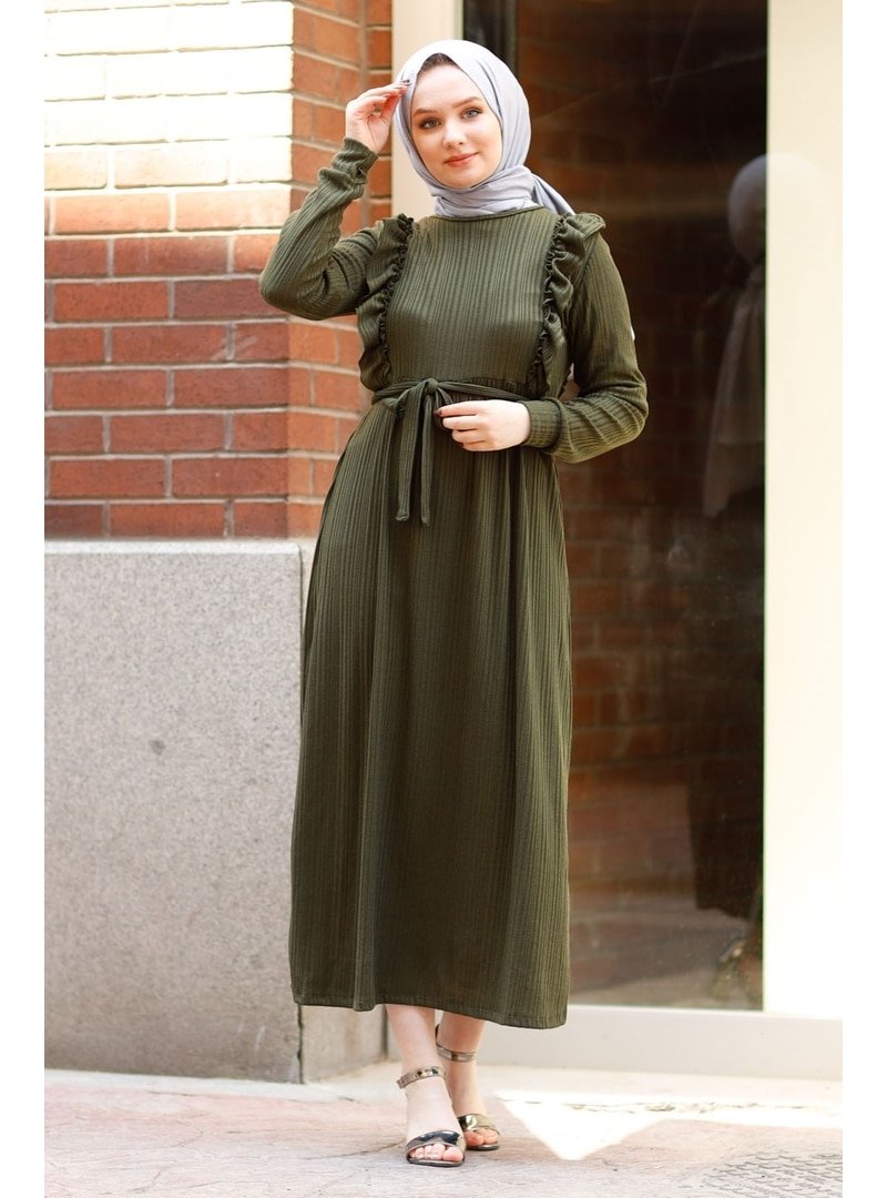 In Style Haki Fırfır Detay Kuşaklı Elbise