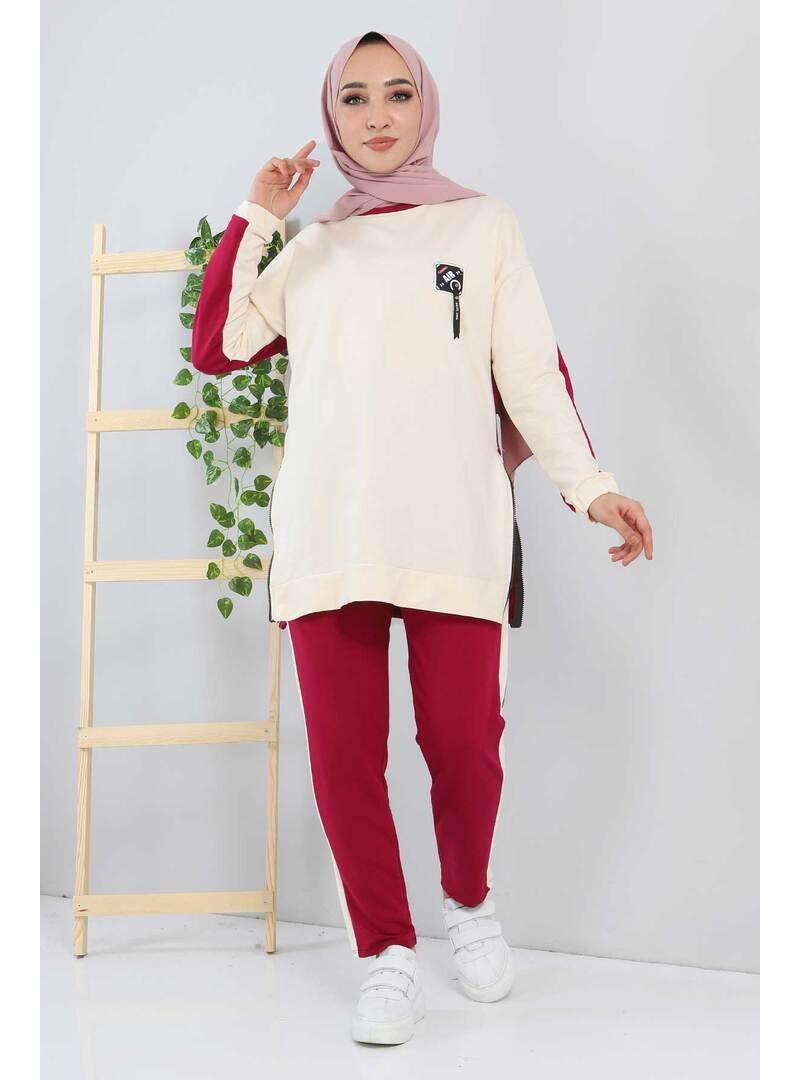 Tesettür Dünyası Bordo Ekru Arma Detaylı İkili Takım