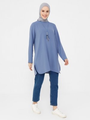 Refka Soğuk Mavi Kolye Detaylı Yanları Yırtmaçlı Aerobin Tunik