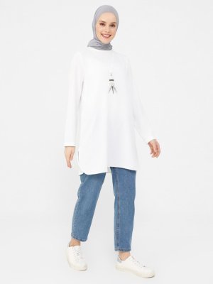 Refka Ekru Kolye Detaylı Yanları Yırtmaçlı Aerobin Tunik