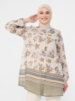 Refka Bej Yeşil Çiçek Desenli Kolları Bağcık Detaylı Astarlı Şifon Tunik