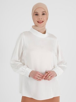 Refka Off White Manşetli Balon Kollu Saten Bluz
