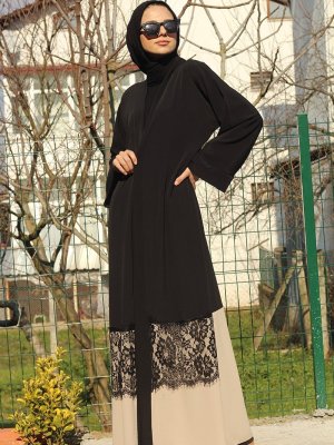 Merve Aydın Siyah Vizon Dantel Detaylı Ferace