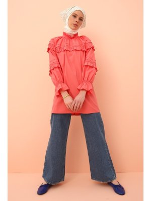 Allday Pembe Pamuk Fırfır Detaylı Oversize Gömlek Tunik