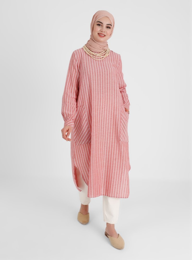 Tavin Kırmızı Cep Detaylı Çizgili Tunik