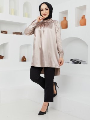 SAHRA BUTİK Kahverengi Kaplama Düğmeli Saten Tunik