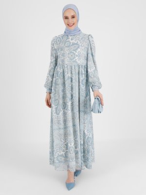 Refka Mavi Çiçek Desen Desenli Astarlı Şifon Elbise