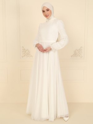Puane Ekru Kol Uçları Lastikli Abiye Elbise