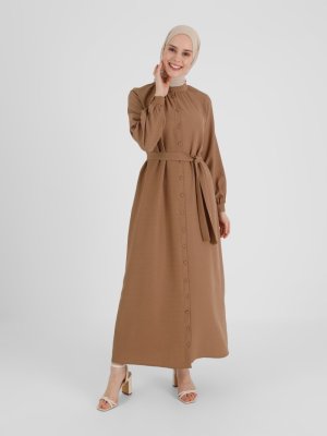 Refka Açık Kahverengi Waffle Efektli Kuşaklı Elbise