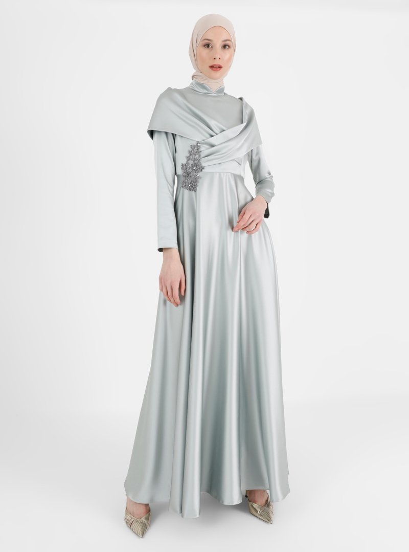 Refka Su Yeşili Omuz Şalı Ve İşleme Detaylı Saten Abiye Elbise
