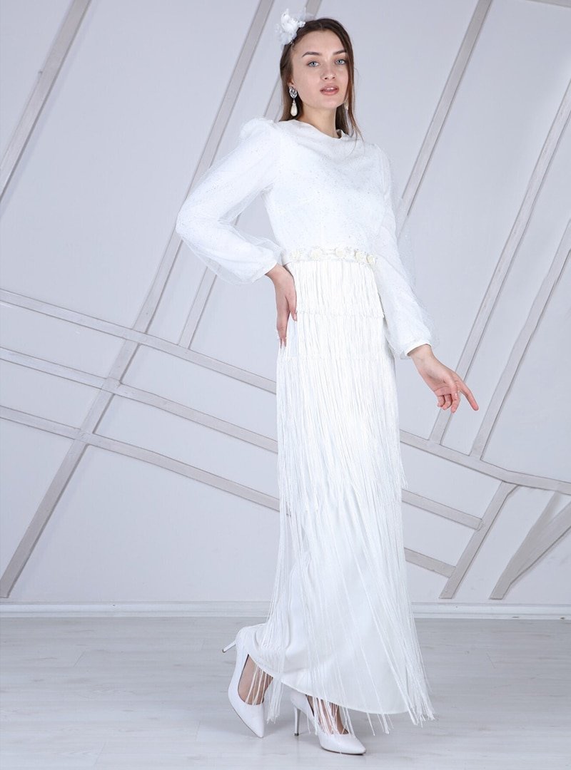 Lady Huri Beyaz Püsküllü Simli Abiye Elbise