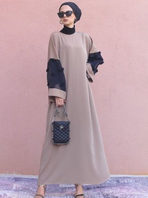 Melek Aydın Sütlü Kahve Kolu Tüy Detaylı Ferace Elbise