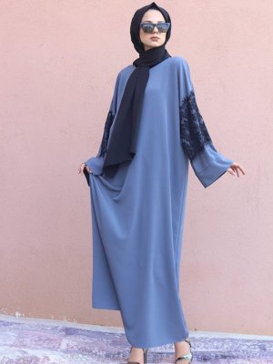 Melek Aydın Koyu Gri Kolu Dantel Detaylı Ferace Elbise