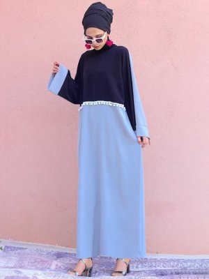 Melek Aydın Önü Ponpon Detaylı Ferace Elbise Siyah Gri