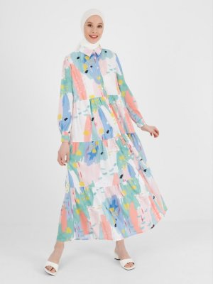 Benin Yeşil Mavi Yaka Katkat Desenli Gömlek Elbise
