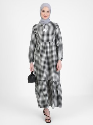 Tekbir Siyah Püskül Detaylı Kareli Elbise