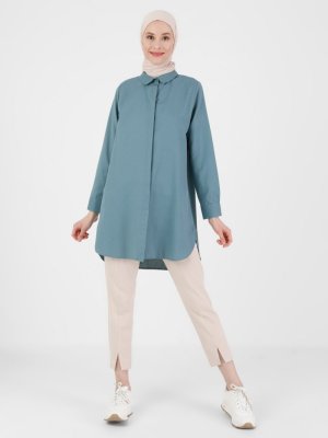 Refka Açık Petrol Oxford Kumaştan Bebe Yaka Gizli Düğmeli Tunik