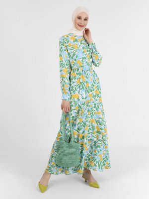 Refka Desenli Yeşil Doğal Kumaşlı Volan Detaylı Elbise