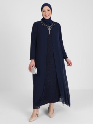 Atay Gökmen Lacivert Yakası Taş Detaylı Simli Abiye Elbise