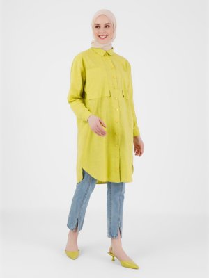 Refka Asit Sarı Çıtçıtlı Uzun Keten Görünümlü Pamuk Tunik