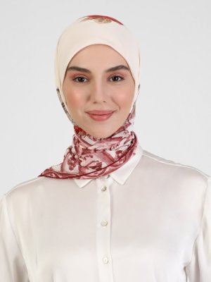 Miray Tablo & Gül Desen Şifon Eşarp Kırık Beyaz Kırmızı