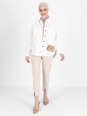 Refka Off White Doğal Kumaşlı Düğmeli Kot Ceket